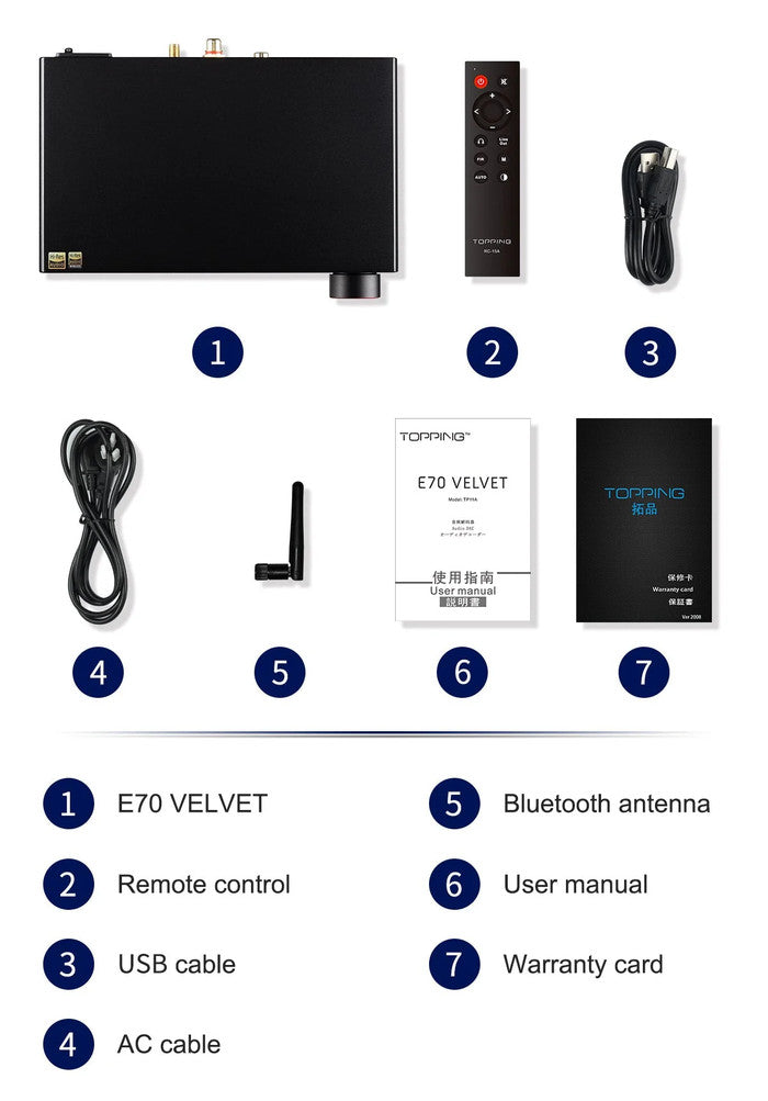Topping E70 Velvet features the latest Bluetooth Chipset bringing high-definition Bluetooth V5.1 wireless connectivity for signal input. It supports most leading high-definition transmission protocols including LDAC, AptX HD, etc.